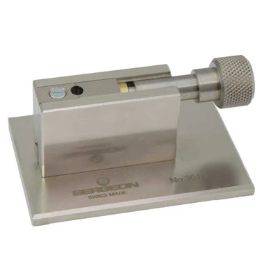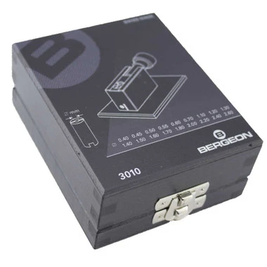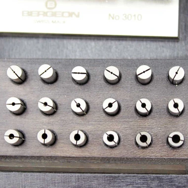 Bergeon tool for tightening crown, case and watch hand tubes. This tool provides even pressure around the tube to ensure that they fit firmly and evenly on the hand arbor or crown. Supplied with 18 interchangeable collets; sizes include: .40, .45, .50, .55, .60, .70, 1.10, 1.20, 1.30, 1.40, 1.50, 1.60, 1.70, 1.80, 2.00, 2.20, 2.40, and 2.60mm.