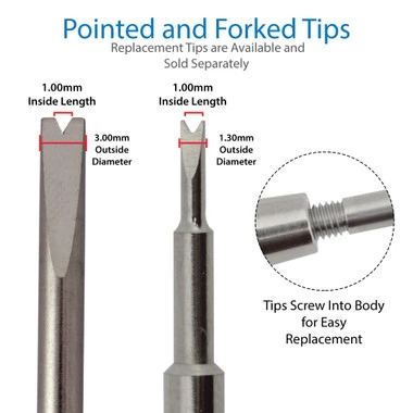 This fine quality steel spring bar tool is designed to last a lifetime. It is the perfect tool for removing spring bars from metal and leather watch bands. The larger forked end works great for opening standard spring bars, and the finer forked end is just right for opening smaller and harder to reach spring bars. The weight, handle knurls, and size make this watch tool ideal for the delicate job of adjusting the size of watch bands or repairing a watch clasp. Each tip is removable and has identical threading making it easy and convenient to change or replace the tips as necessary for repair work.