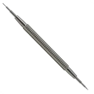 Bergeon introduced this improved spring bar tool in 2017. It features all stainless steel construction with a textured, comfortable handle. Forked end is 1.20mm wide and point end diameter is 0.80mm. Tips are hardened steel and thread into tool; spare tips are available. It is the perfect tool for removing spring bars from metal and leather watch bands. The forked end works great for opening spring bars and the pointed end is just right for compressing shouldered spring bars from the lug holes.
