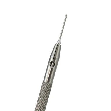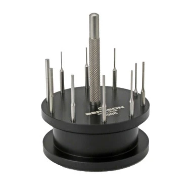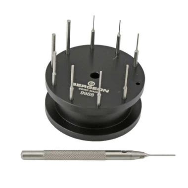 A tool to drive out pins in watch bands. Assortment of 10 pins friction fit into the knurled handle and supplied with a convenient stand for bench-top storage.