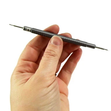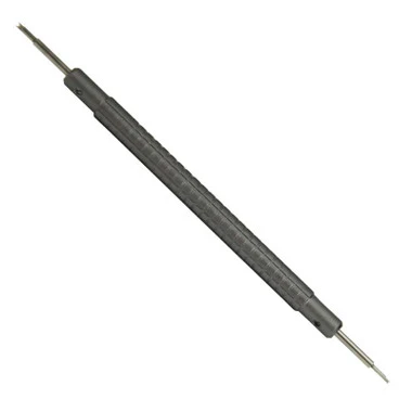 This spring bar is made of an anodized aluminum body with hardened steel tips. Both ends on this tool are forked ; the larger forked end works great for opening standard spring bars, and the finer forked end is just right for opening smaller and harder to reach spring bars. The weight, handle knurls, and size make this watch tool ideal for the delicate job of adjusting the size of watch bands or repairing a watch clasp. Each tip is removable and held in place with a set screw.