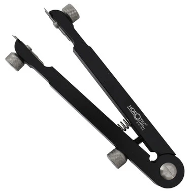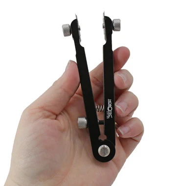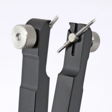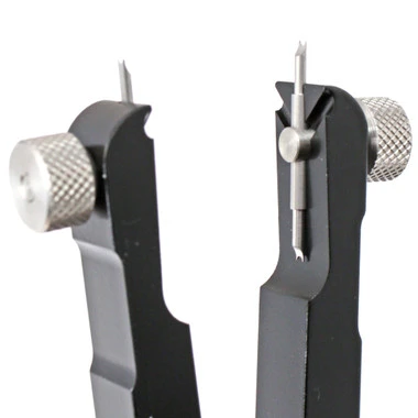Horotec’s spring bar plier is one of the best available. Used to precisely remove and insert spring bars. It features 2 forked tips which grip and compress the spring bar from both sides and adjusts easily up to 45mm with the knurled set screw. It features a solid aluminum body with hardened steel (hrc 54+/-2) fork tips, which are reversible. Supplied with extra fine tips, just 1.10mm wide and only 0.23mm thick, to fit into tiny spaces between the bracelet and watch case lugs. Replacement fork tips are available in two sizes: 1.10 x 0.23mm and 1.30 x 0.30mm. This very fine quality tool offers these advantages: