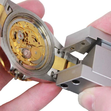 This professional grade tool removes spring bars without having to take the watch bracelet clasp off. This small tool fits in the palm of your hand and features angled tips that evenly compress the spring bar for simple removal without slipping or scratching the case. Knob on side of tool adjusts the width between the tips to fit most watches. Hardened steel tips are extra fine, just 1.0mm, ideal for brands with very little space between the case lugs and bracelet.