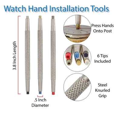 Quartz and mechanical watch hand presser watchmakers tool for replacing watch hands. Features steel construction with non scratching ends and a knurled grip. To help in putting the hands on with no slipping and even pressure so they do not bend the hands or the watch movement post. Double ended for various size watch hands and posts. Set includes 3 double-sided hand tools, 5 soft tips with varying size holes and 1 solid end brass tip.
